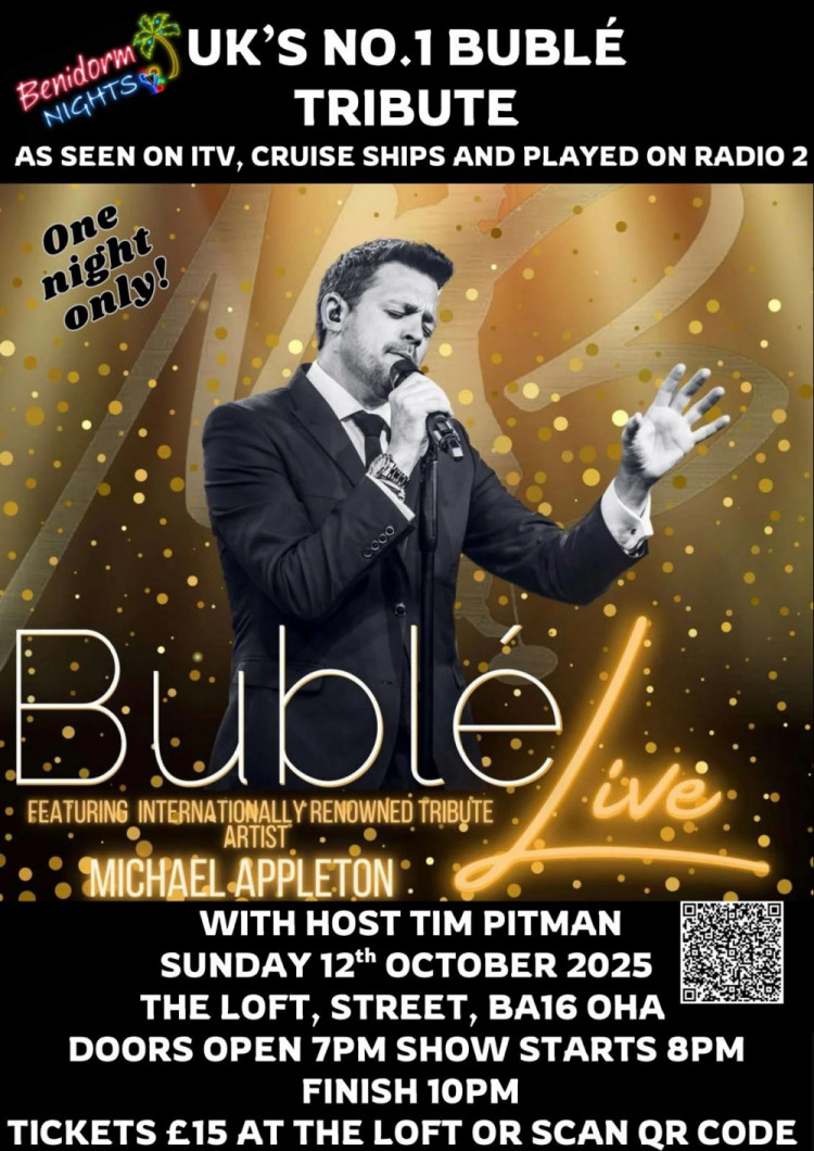 Sat 4 Oct is bursting with options. Benidorm Nights – Michael Bublé Tribute brings Mike Appleton to The Loft in Street for a full-on Bublé tribute, complete with signature microphone and those crooner hand gestures.