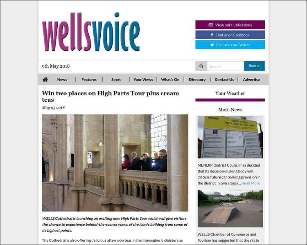 The Cathedral is also offering delicious afternoon teas in the atmospheric cloisters as part of a new 'pop up café' experience.And Wells Voice readers have the chance to combine the two if they win this month's mouthwatering competition. We have teamed up with Wells Cathedral to offer two winners two places each on a High Parts Tour as well as a cream tea.