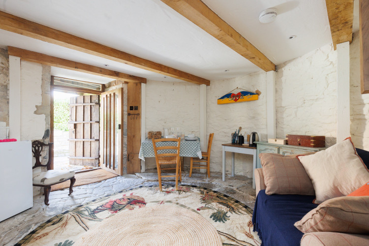 Known collectively as Old Cock Pit Barn, the two buildings make a compelling pair: the main house is modern and bright with exposed beams and a double-height living space, while the annexe is a rare Grade II listed cottage once used for cock-fighting.