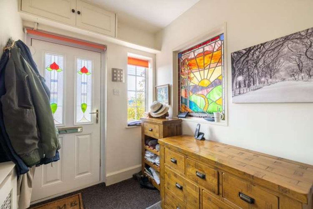 The front door opens into a hall with the sitting room to the left which has a large bay window, a cast iron fireplace with an inset gas fire and two side alcoves with cupboards. An attractive feature is the stained glass window to the hall.